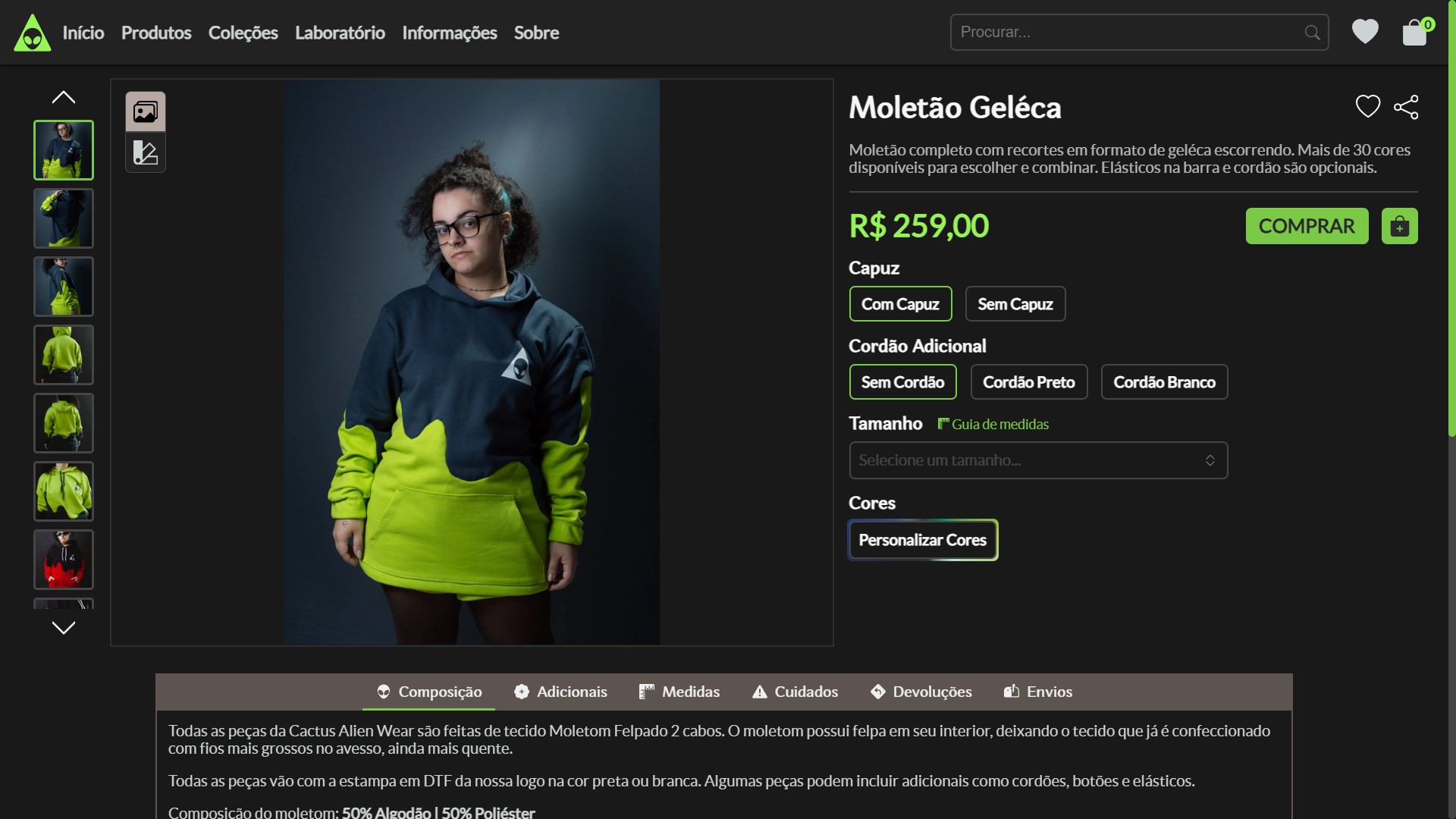 Na página do produto escolhido, defina os detalhes de sua preferência e escolha o tamanho usando o guia de medidas como referência (ou mande suas medidas personalizadas). Em sequida clique no botão Personalizar Cores.